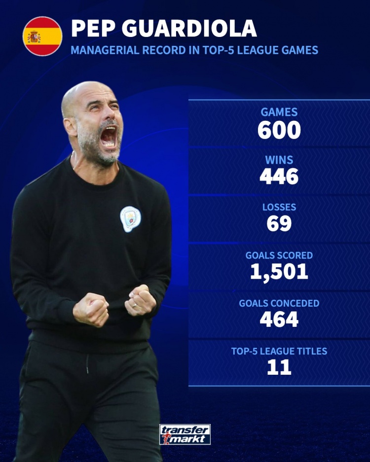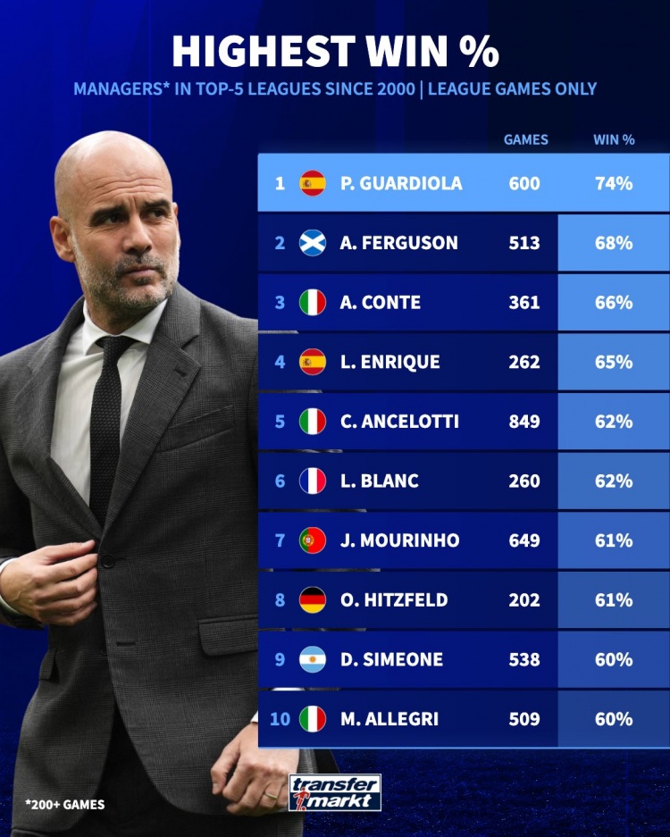 9月15日訊 德國(guó)轉(zhuǎn)會(huì)市場(chǎng)統(tǒng)計(jì)了本世紀(jì)五大聯(lián)賽教練的聯(lián)賽勝率,并列出榜單,瓜迪奧拉執(zhí)教600場(chǎng),取勝446場(chǎng),勝率74%居首。