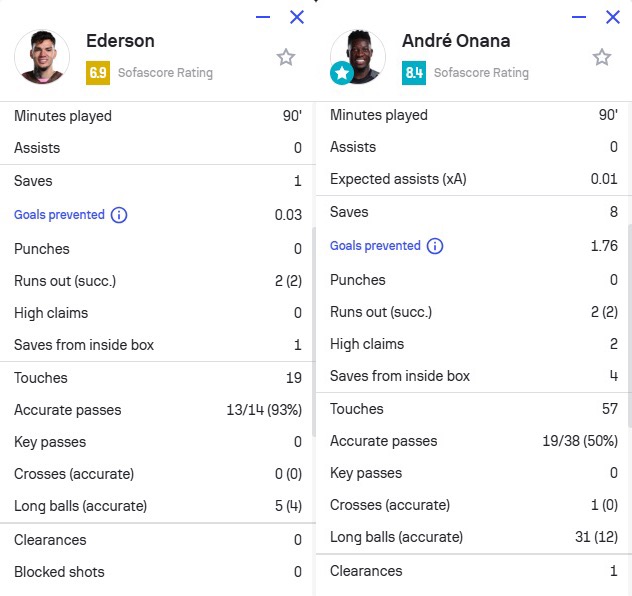 奧納納和埃德森本場比賽都稱得上成功,前者完全投入和專注,做出了一些聰明的反應(yīng)和撲救,他沒有時間想太多,也沒有時間做任何愚蠢的事,可以說是場上最好的球員。