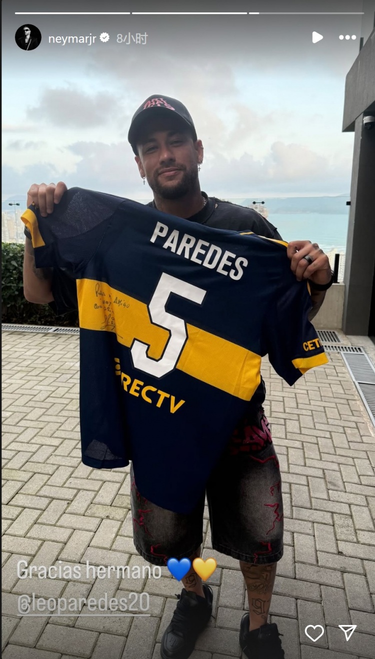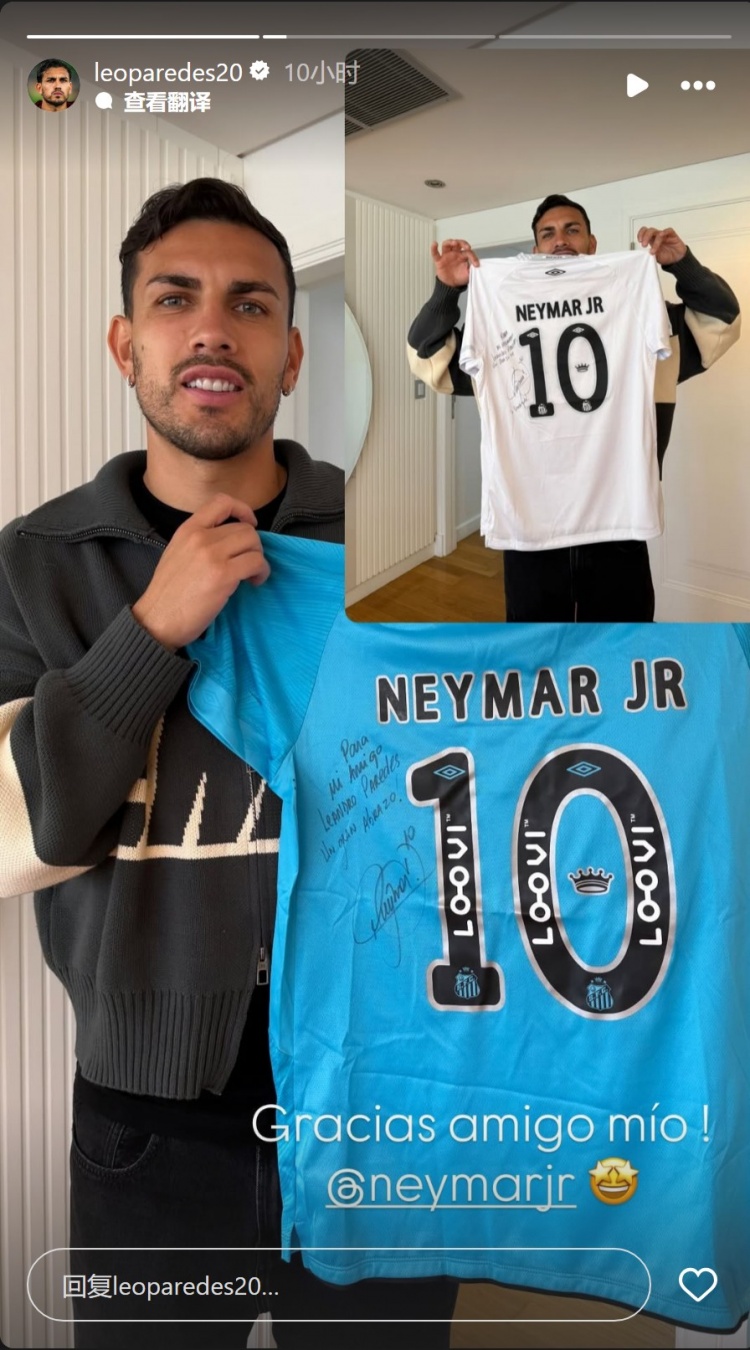 內(nèi)馬爾也曬出手拿帕雷德斯球衣的照片,配文:“感謝兄弟?!?/p>