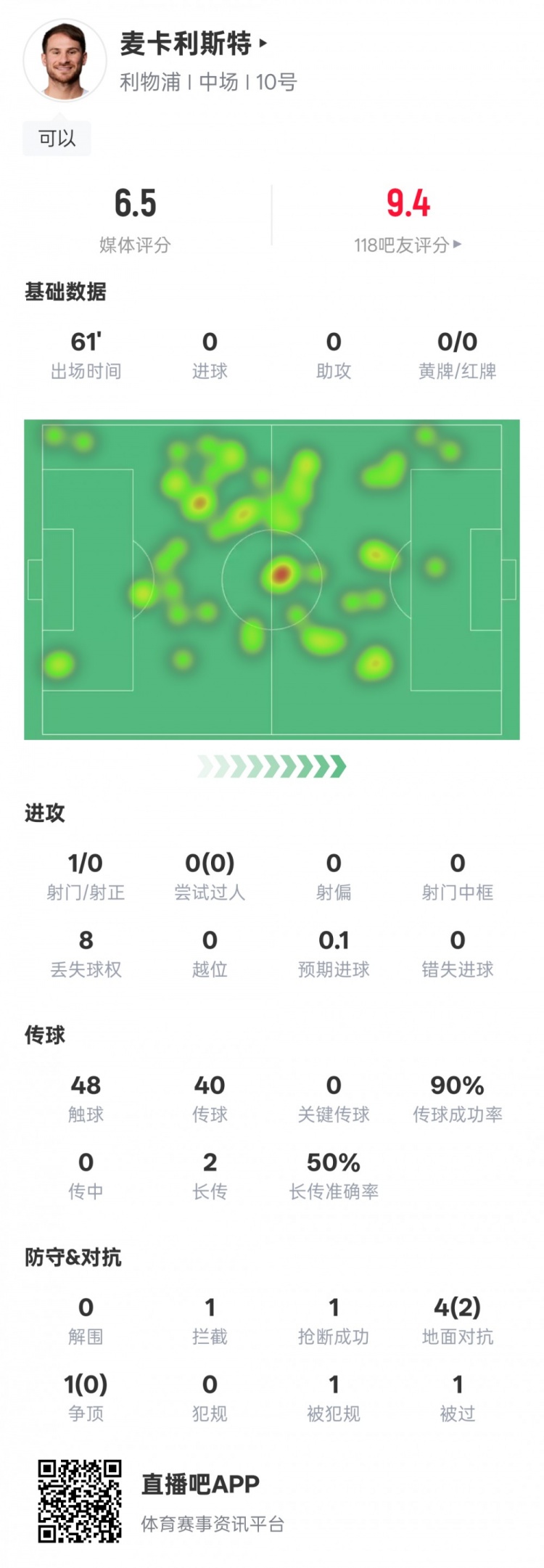 9月20日訊 2025-26賽季英超聯(lián)賽第5輪,利物浦主場迎戰(zhàn)埃弗頓。麥卡利斯特首發(fā)出戰(zhàn),傳球成功率90%,還有1次攔截和1次搶斷,評分6.5。