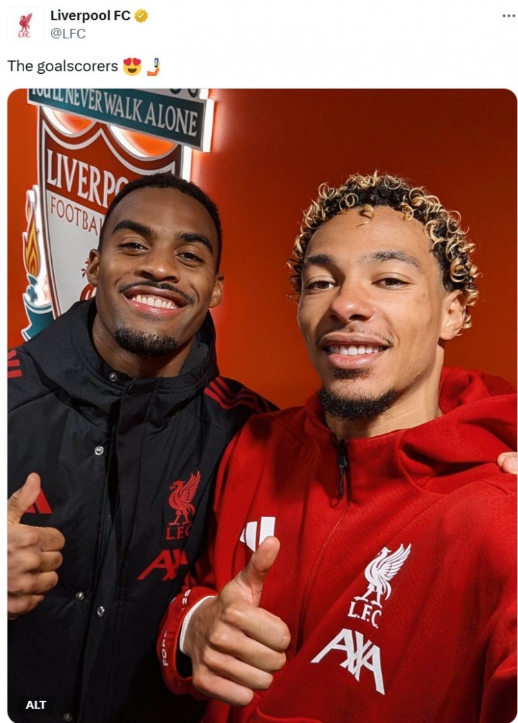 本場比賽赫拉芬貝赫傳射建功,?;倏艘踩〉眠M球。利物浦官推曬出兩人賽后的合影,配文:“進球者自拍!”
