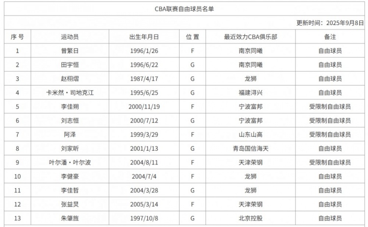 9月8日訊 CBA官網(wǎng)今天更新了聯(lián)賽自由球員名單,新增曾繁日等人。