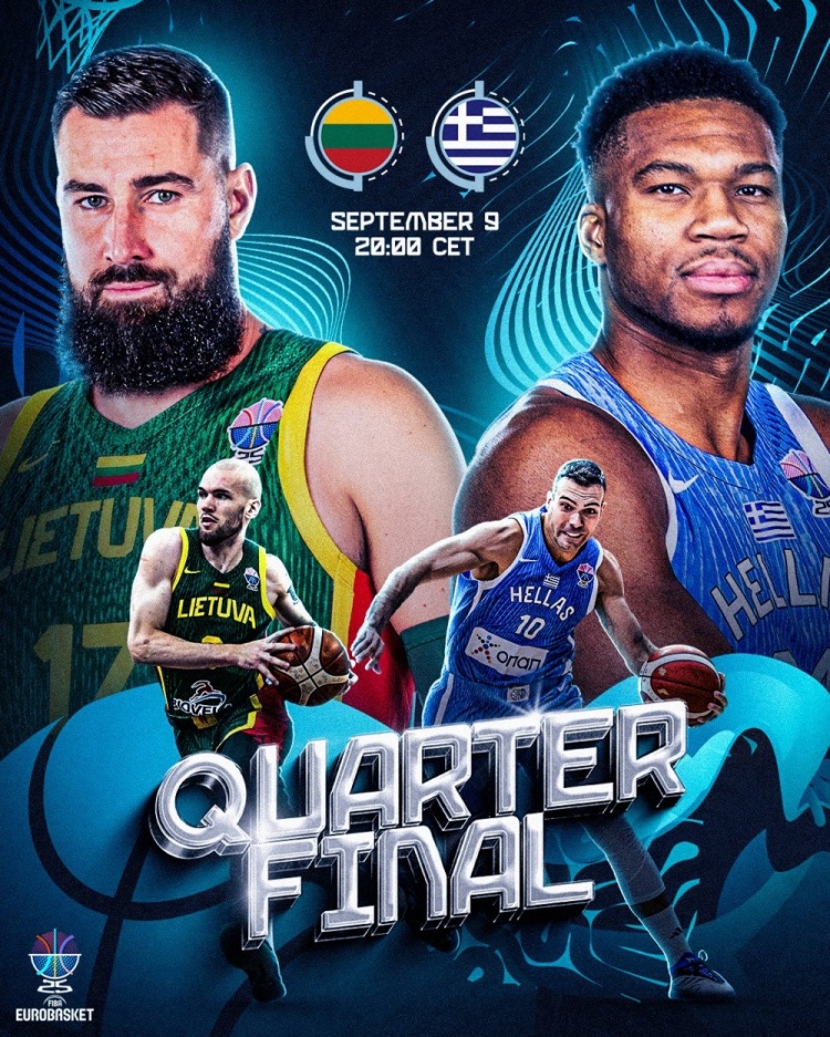 9月10日訊 男籃歐錦賽1/4決賽,希臘對(duì)陣立陶宛。
