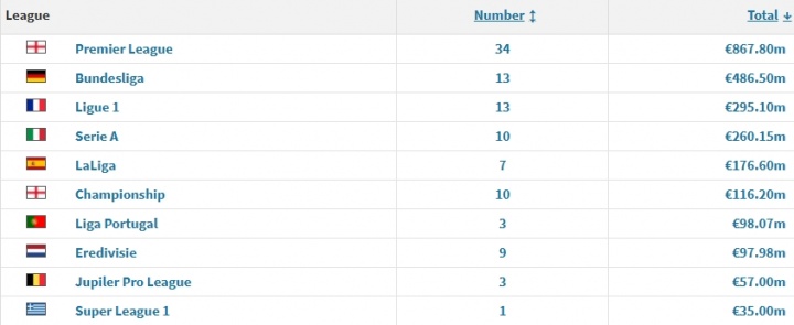 08月21日訊 德轉(zhuǎn)統(tǒng)計了夏窗截至目前英超球隊的引援來源,其中來自英超內(nèi)部的人數(shù)最多,有34人,德甲位居第二,共有13人,花費4.865億歐。