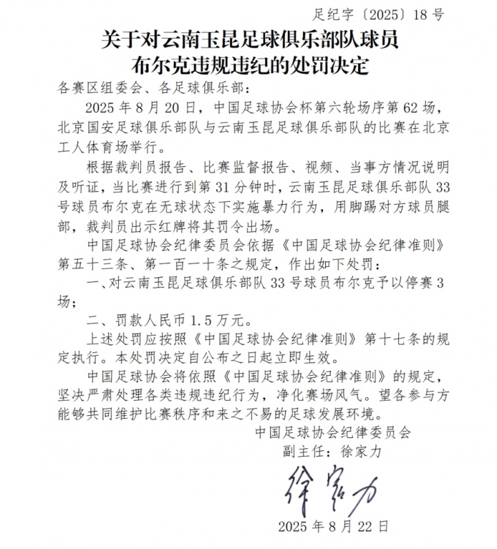 值得一提的是,此前云南玉昆官方發(fā)布公告,表示布爾克行為損害球隊(duì)利益,處以10萬罰款。因此布爾克因?yàn)檫@張紅牌總計(jì)被罰了11.5萬元。