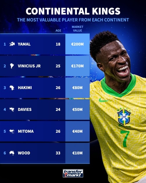 8月23日訊 德國轉(zhuǎn)會市場列出了各大洲身價最高的球員,以及各大洲的球員總身價。
