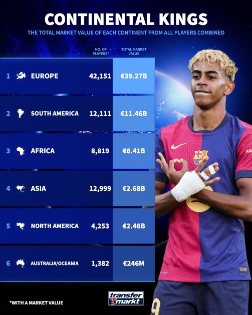 各大洲球員總身價排名(有德轉(zhuǎn)身價的球員):