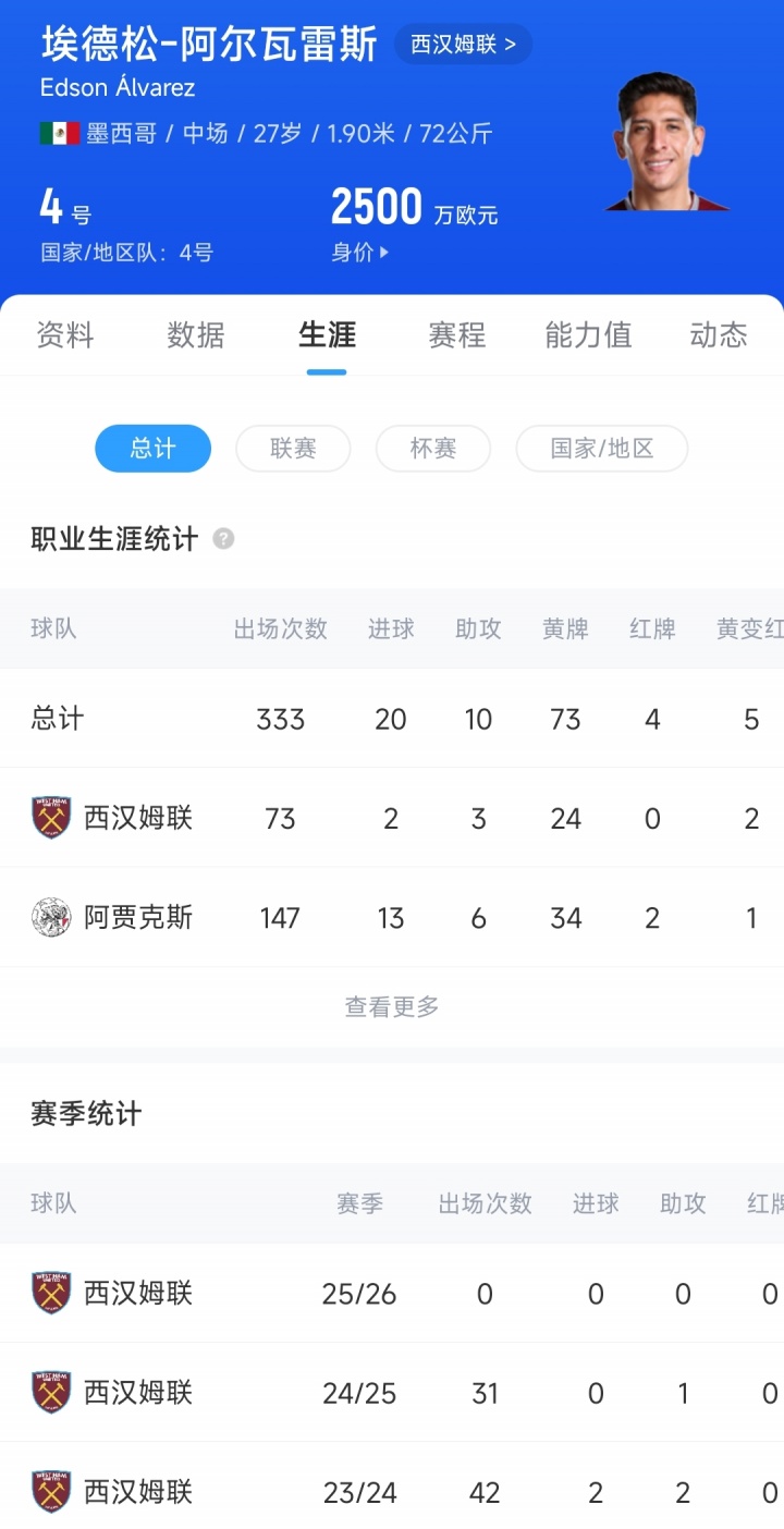 27歲的墨西哥中場(chǎng)埃德松-阿爾瓦雷斯,2023年以3800萬歐元的轉(zhuǎn)會(huì)費(fèi)加盟西漢姆聯(lián),上賽季代表西漢姆聯(lián)出戰(zhàn)31場(chǎng)比賽,貢獻(xiàn)1次助攻。目前阿爾瓦雷斯的德轉(zhuǎn)身價(jià)為2500萬歐元,他也成為了費(fèi)內(nèi)巴切今年夏窗的第8筆引援。