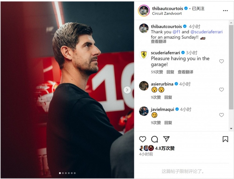 9月2日訊 皇馬門(mén)將庫(kù)爾圖瓦更新社媒動(dòng)態(tài),曬出造訪法拉利車(chē)隊(duì)的照片。