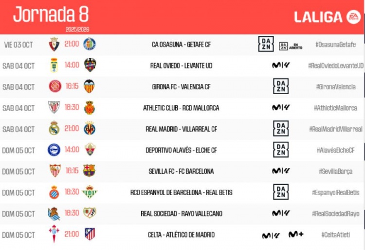 9月9日訊 本周一,西甲聯(lián)賽官方公布了本賽季聯(lián)賽第8輪的賽程時間安排,比賽從10月4日03:00(北京時間,以下都是)到10月6日03:00。