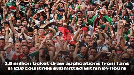 預(yù)售抽簽開放僅24小時,F(xiàn)IFA就收到了來自全球各地的大量申請,已有來自210個國家的超過150萬名球迷完成注冊。