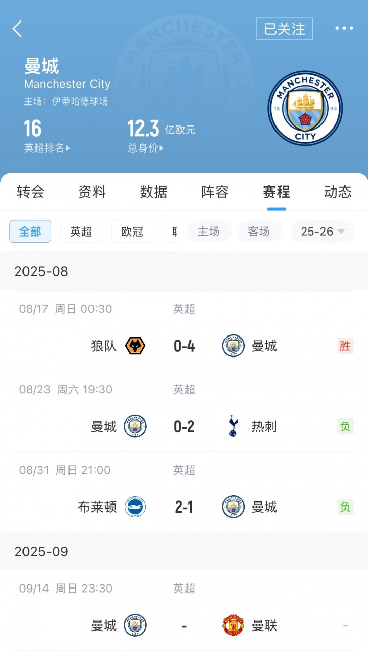 而上一次曼城在前4輪聯(lián)賽輸?shù)?場比賽還是在1995-96賽季,當(dāng)賽季他們最終慘遭降級。