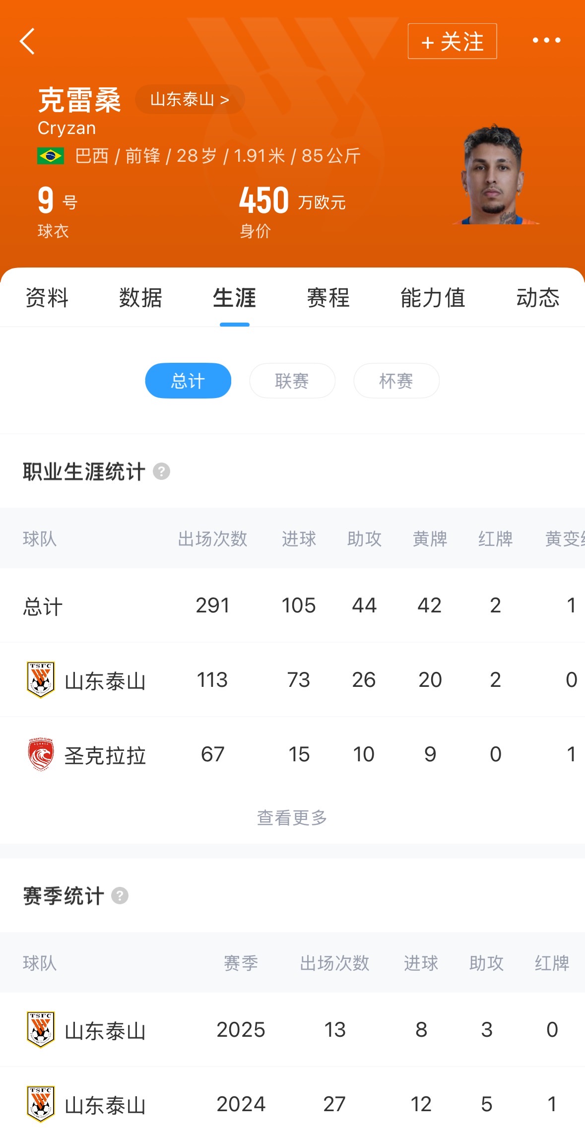 克雷桑至今代表泰山總計(jì)出場113次,貢獻(xiàn)73球26助。目前球員德轉(zhuǎn)身價(jià)為450萬歐元。