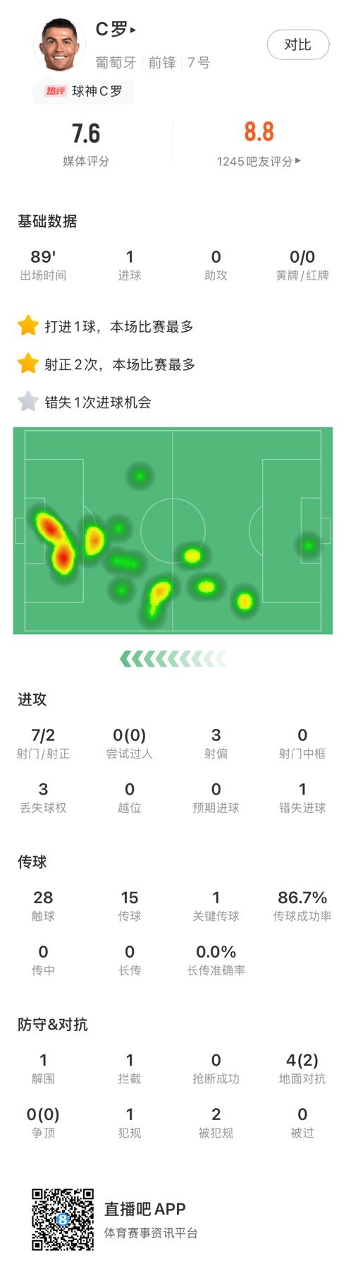 6月5日訊 歐國聯(lián)A聯(lián)賽半決賽,德國對陣葡萄牙,C羅在第89分鐘被換下,球員全場數(shù)據(jù)如下: