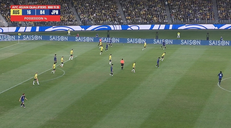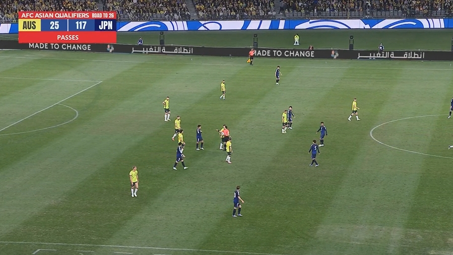 比賽開場(chǎng)10分鐘,日本控球率高達(dá)84%,共2腳射門0射正,完成了117腳傳球,傳球成功率高達(dá)91% ;澳大利亞僅25腳傳球,傳球成功率56%,沒有完成射門。