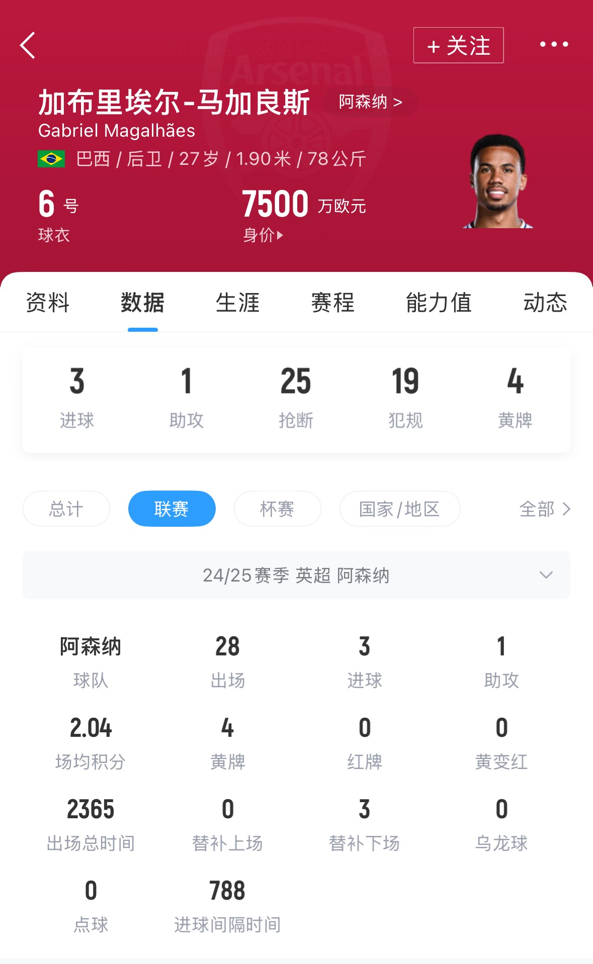 加布里埃爾2020年從里爾加盟阿森納,轉(zhuǎn)會(huì)費(fèi)2600萬(wàn)歐。目前共代表阿森納出場(chǎng)210次,打進(jìn)20球并送出5次助攻。隨隊(duì)拿到一次社區(qū)盾杯冠軍。此前,加布里埃爾與槍手的合同到2027年6月,球員24/25賽季出場(chǎng)42次,德轉(zhuǎn)身價(jià)7500萬(wàn)歐。