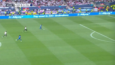 06月08日訊 歐國(guó)聯(lián)季軍戰(zhàn),德國(guó)0-2落后法國(guó),德國(guó)中衛(wèi)科赫中圈解圍失誤送禮,塔瘋狂回追,仍難阻奧利塞進(jìn)球!