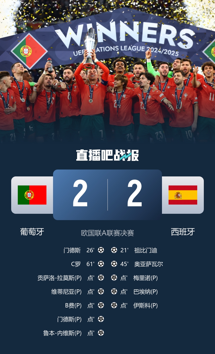 6月9日訊 北京時間6月9日凌晨3:00,歐國聯(lián)A聯(lián)賽決賽,葡萄牙對陣西班牙。上半場葡萄牙防線解圍失誤,祖比門迪破門,努諾-門德斯扳平,奧亞薩瓦爾進(jìn)球再度將比分超出,葡萄牙暫1-2西班牙;下半場B費破門,但這球內(nèi)托觸球時越位在先無效,C羅扳平,隨后在比賽尾聲階段傷退,常規(guī)時間葡萄牙2-2西班牙,比賽進(jìn)入加時;加時賽兩隊均無建樹,仍2-2戰(zhàn)平;點球大戰(zhàn),葡萄牙5人均罰中,西班牙莫拉塔失點,最終葡萄牙點球大戰(zhàn)5-3西班牙,第二次贏得歐國聯(lián)冠軍。