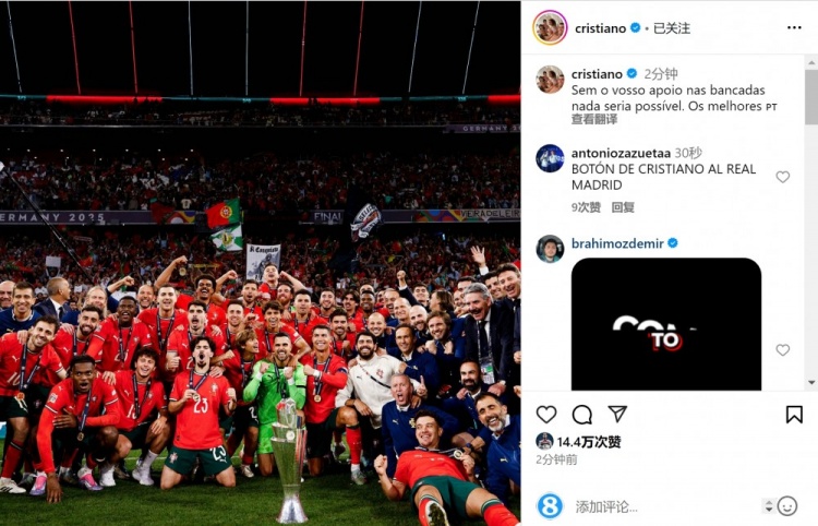 C羅社媒曬出全隊(duì)與獎(jiǎng)杯的合照,對(duì)球迷表示感謝,他寫道:“沒有你們?cè)诳磁_(tái)上的支持,這一切都不可能實(shí)現(xiàn)。最好的(球迷)!”