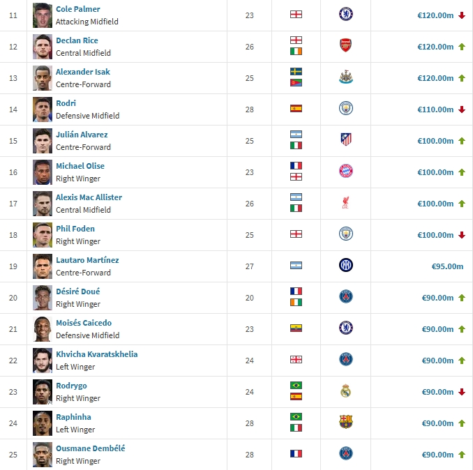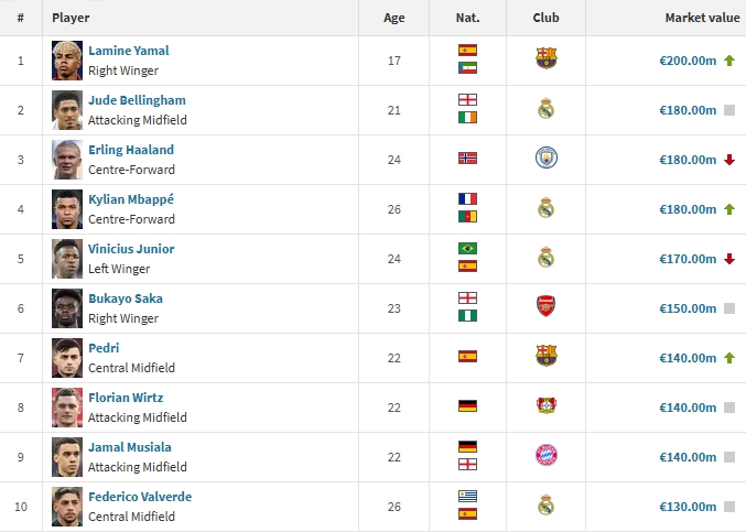 06月09日訊 德轉(zhuǎn)更新了最新一期西甲球員身價,亞馬爾取代維尼修斯成為新的足壇第一身價,足壇前十身價也發(fā)生了一系列變動。