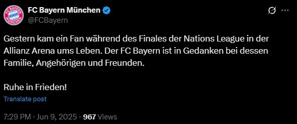 6月9日訊 拜仁官推今天發(fā)文,悼念了一位在歐國聯(lián)決賽期間離世的球迷。