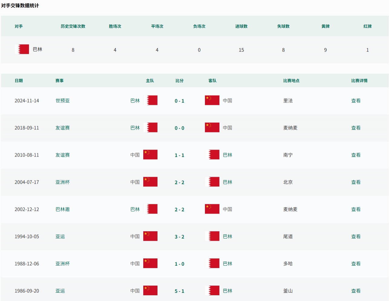 據(jù)中國足協(xié)官網(wǎng)統(tǒng)計,中國隊歷史上共交手巴林8次,取得4勝4平、進15球丟8球的戰(zhàn)績。本屆18強賽首回合交手時,國足最后時刻由張玉寧攻入制勝進球。