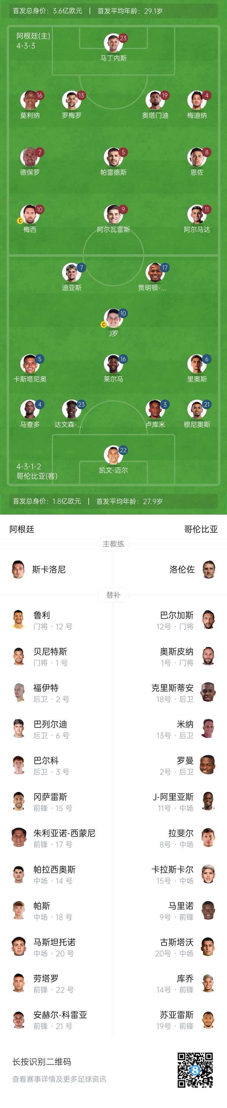 阿根廷首發(fā):23-馬丁內(nèi)斯、16-莫利納、13-羅梅羅、19-奧塔門(mén)迪、4-梅迪納、7-德保羅、5-帕雷德斯、8-恩佐-費(fèi)爾南德斯、10-梅西、9-阿爾瓦雷斯、11-阿爾馬達(dá)