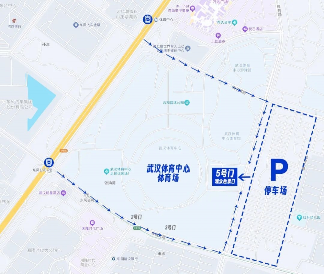 1、比賽觀眾入口為武漢體育中心5號門,球迷朋友們可乘坐地鐵3號線在“體育中心”或“東風公司”站下車,或乘坐地鐵6號線在“東風公司”站下車,步行前往5號門入口。自駕前往體育場的球迷朋友可將車輛停放至體育中心5號門公共停車場,或周邊商圈停車場,再步行前往入口。