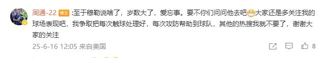 周通:“至于穆勒說啥了,歲數大了,愛忘事。要不你們問問他去吧。大家還是多關注我的球場表現吧,我爭取把每次觸球處理好,每次攻防幫助到球隊,其他的熱搜我就不要了,謝謝大家的關注?!?/p>