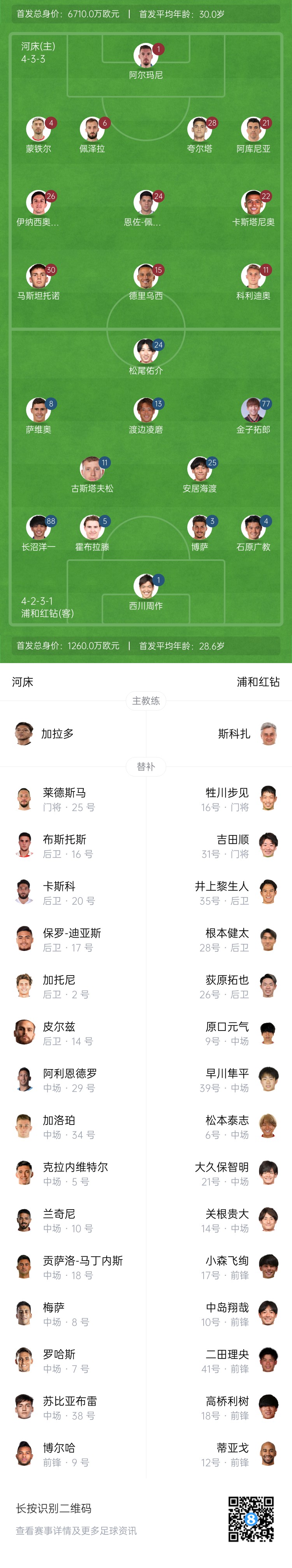 浦和紅鉆首發(fā):1-西川周作、3-博扎、4-石原廣教、5-霍布拉滕、8-馬特烏斯-薩維奧、11-古斯塔夫松、13-渡邊凌磨、25-安居海渡、88-長(zhǎng)沼洋一、24-松尾佑介、77-金子拓郎