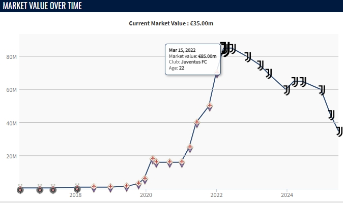 06月18日訊 昨日德轉(zhuǎn)更新了意甲球員身價(jià),尤文前鋒弗拉霍維奇身價(jià)下跌1000萬歐,現(xiàn)身價(jià)僅剩3500萬歐。