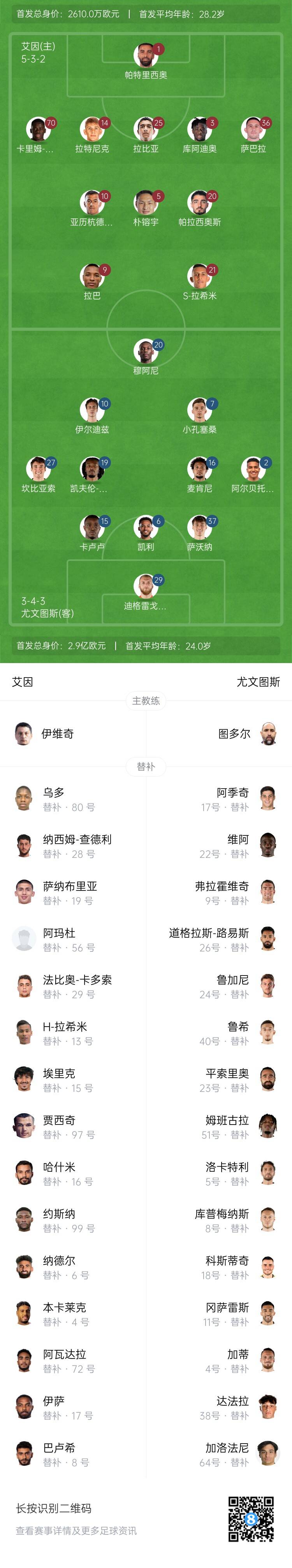 尤文替補(bǔ):23-平索里奧、38-達(dá)法拉、64-加洛法尼、4-加蒂、24-魯加尼、40-魯希、5-洛卡特利、8-庫(kù)普梅納斯、17-阿季奇、18-科斯蒂奇、26-道格拉斯-路易斯、9-弗拉霍維奇、11-岡薩雷斯、22-維阿、51-姆班古拉