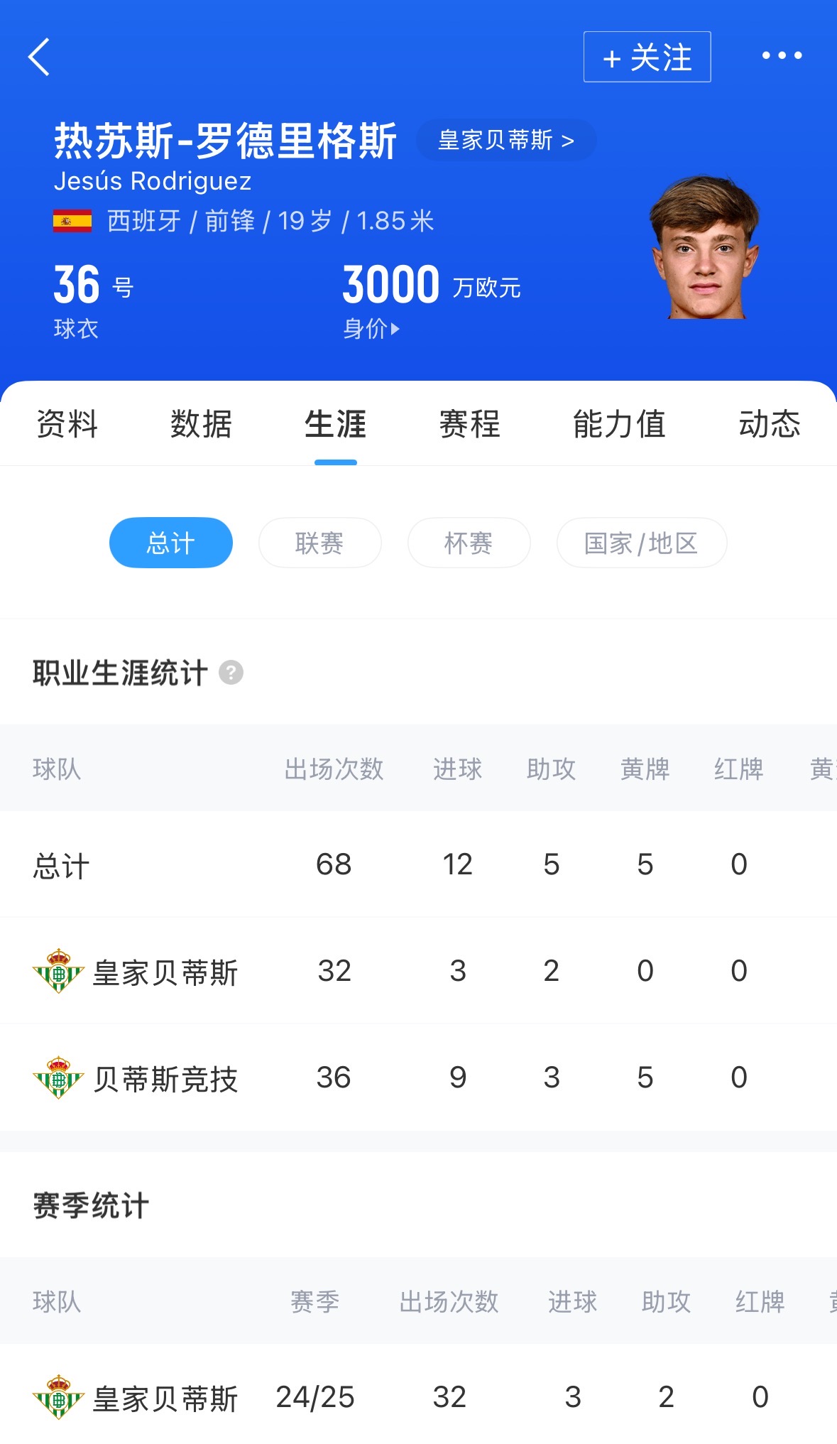 19歲的西班牙前鋒熱蘇斯-羅德里格斯為皇家貝蒂斯青訓培養(yǎng)的新星,上賽季被皇家貝蒂斯提至一線隊,為一線隊出場32次貢獻3球2助。球員目前的德轉身價為3000萬歐元。