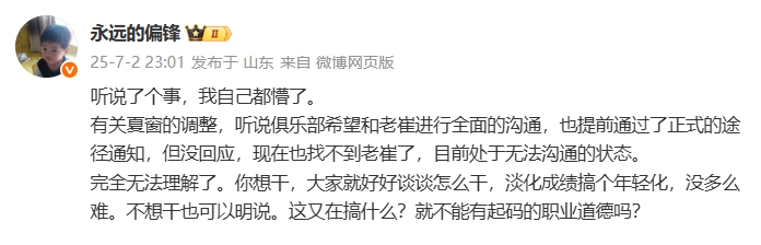 有關(guān)夏窗的調(diào)整,聽(tīng)說(shuō)俱樂(lè)部希望和老崔進(jìn)行全面的溝通,也提前通過(guò)了正式的途徑通知,但沒(méi)回應(yīng),現(xiàn)在也找不到老崔了,目前處于無(wú)法溝通的狀態(tài)。