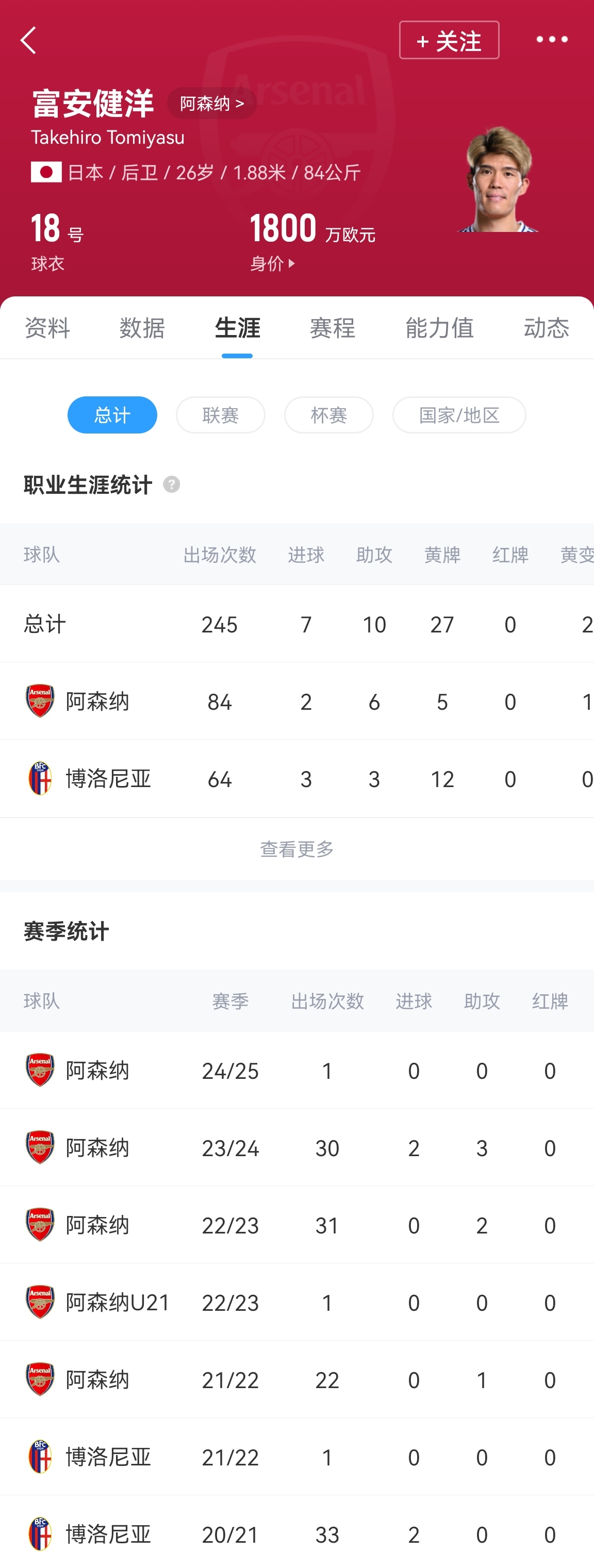 富安健洋2021年以1860萬歐的轉(zhuǎn)會費的加盟阿森納,之后共為槍手出場84次,他與阿森納的合同下賽季才結(jié)束。24/25賽季初富安健洋僅出場1次,時長6分鐘。