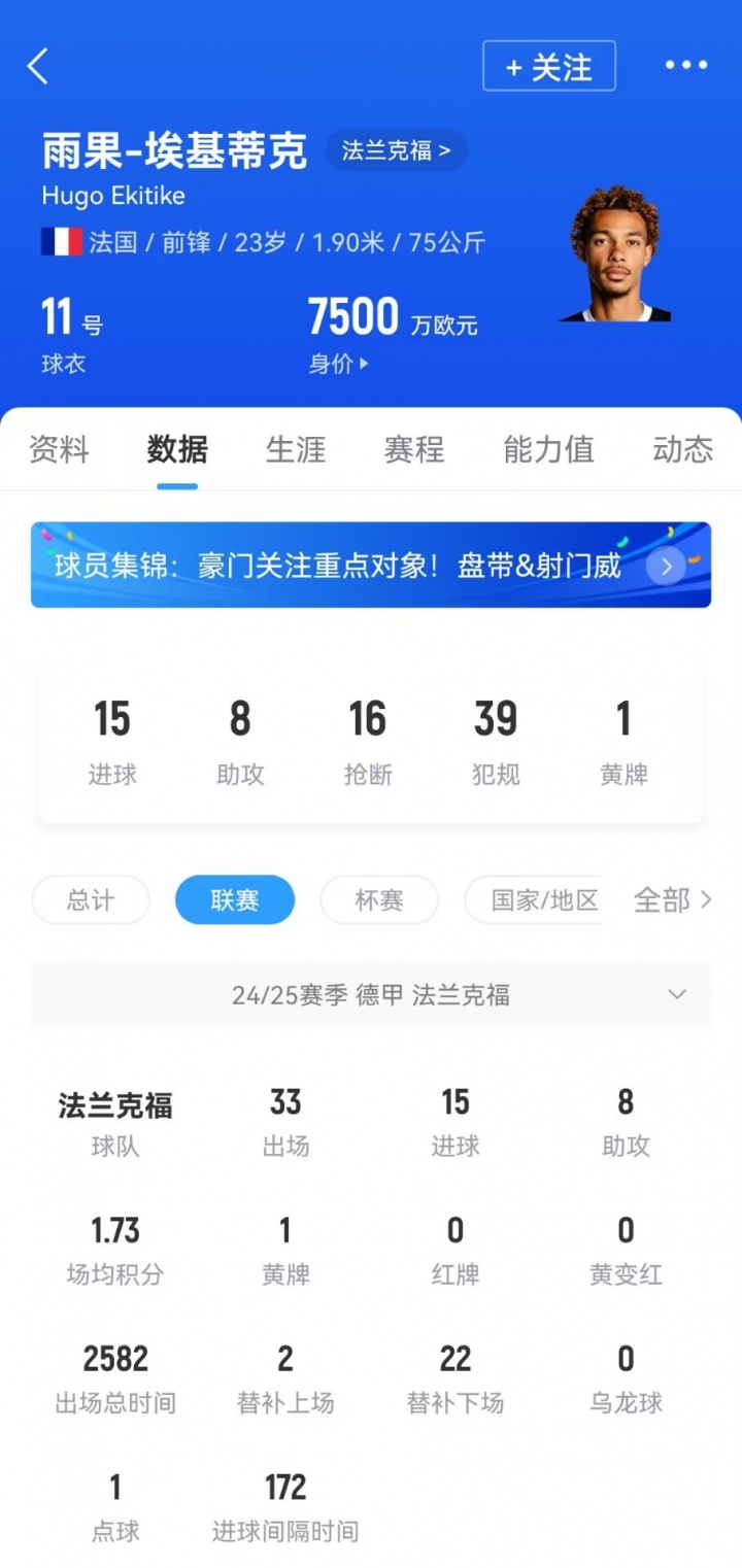 ?;倏松腺惣緸榉ㄌm克福在德甲出場33次,貢獻15球8助攻,球員目前的德轉身價為7500萬歐元。