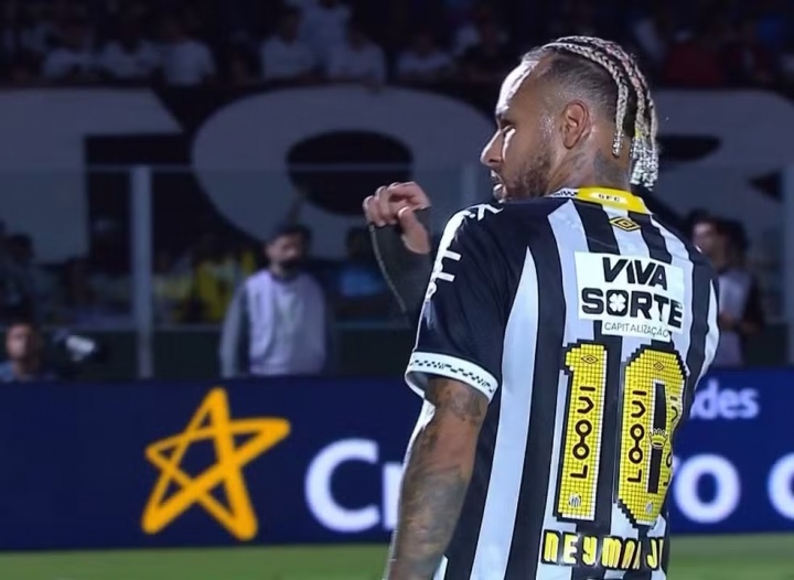 比賽下半場(chǎng)尾聲階段,內(nèi)馬爾被看臺(tái)上的挑釁激怒,他朝向?qū)κ智蛎?,手指桑托斯?duì)徽上的兩顆星,并且作出“閉嘴”的手勢(shì),隨后,他還比劃了一個(gè)手勢(shì),似乎是在諷刺對(duì)方是“小俱樂部”。