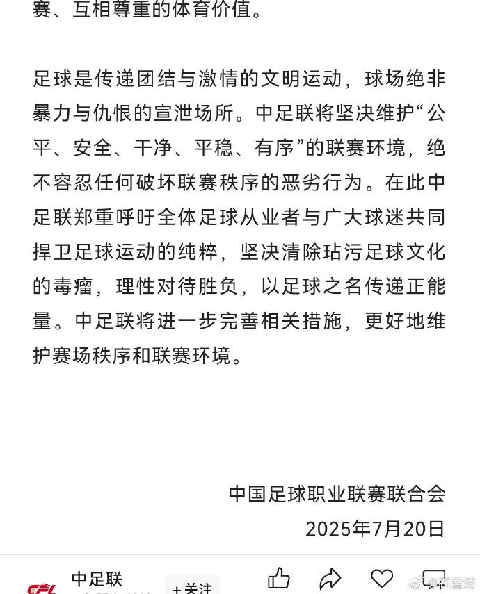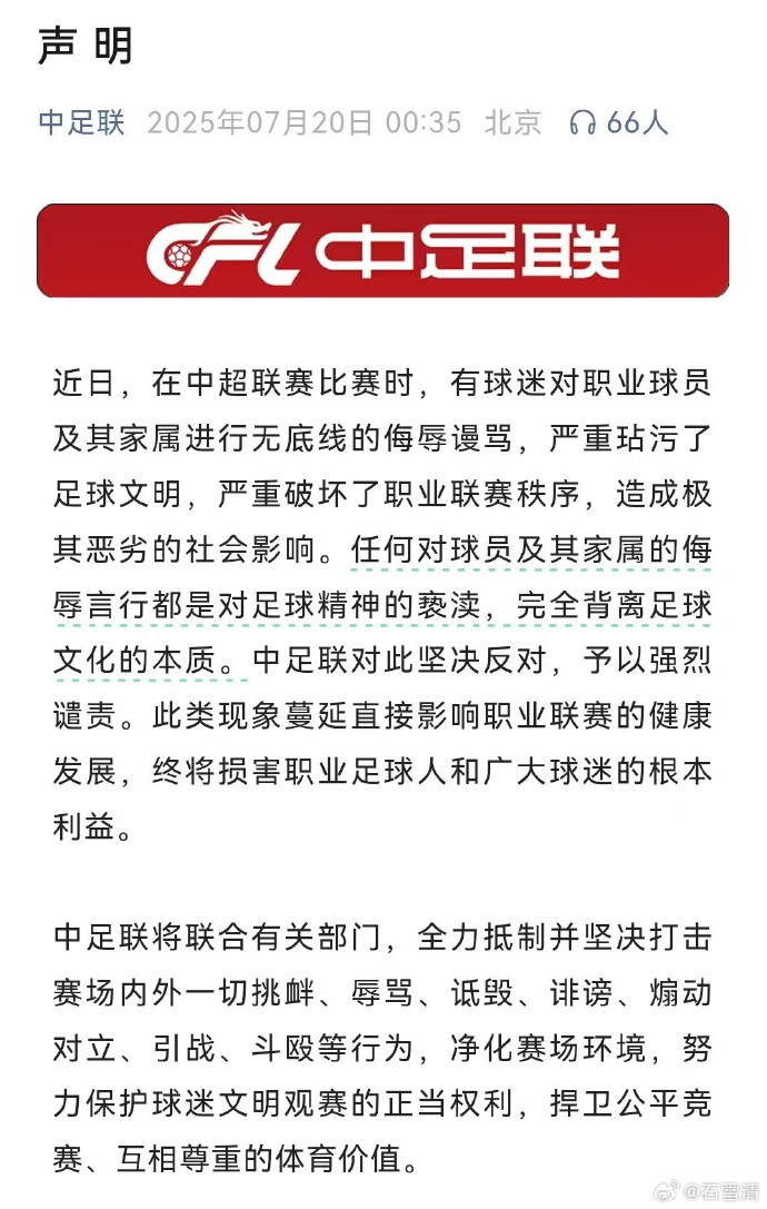 因為,聲明中竟然不敢明確指出是“中超聯(lián)賽”中“哪個俱樂部”的球迷辱罵球員家屬!