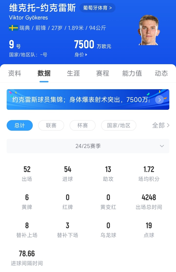 現(xiàn)年27歲的約克雷斯上賽季為葡萄牙體育出戰(zhàn)52場比賽,收獲54球13助。這位瑞典國腳現(xiàn)身價7500萬歐。