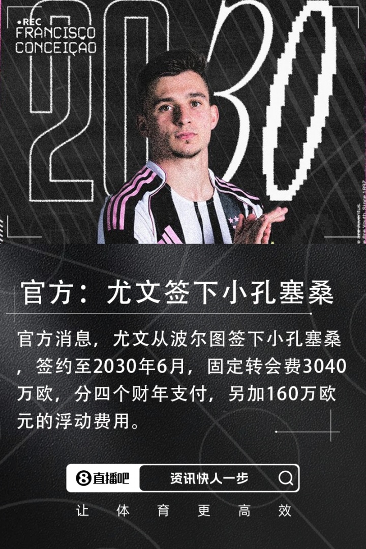 官方消息,尤文從波爾圖正式簽下小孔塞桑,簽約至2030年6月。尤文官方確認(rèn),小孔塞桑固定轉(zhuǎn)會(huì)費(fèi)3040萬(wàn)歐,分四個(gè)財(cái)年支付,另加160萬(wàn)歐元的浮動(dòng)費(fèi)用。