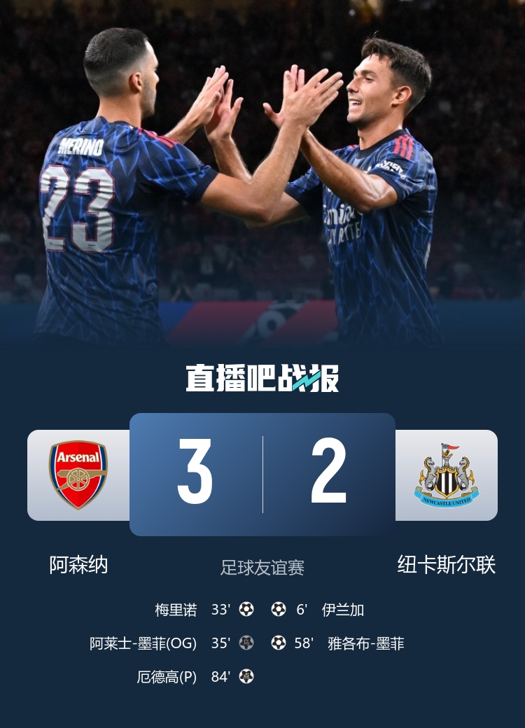 7月27日訊 北京時間7月27日19:30,足球友誼賽阿森納迎戰(zhàn)紐卡斯?fàn)柕谋荣愒谛录悠聡殷w育場進(jìn)行,上半場伊蘭加開場閃擊得手,哈弗茨助攻梅里諾推射破門扳平比分,墨菲門前解圍自擺烏龍,半場結(jié)束,阿森納2-1紐卡。下半場雅各布墨菲低射破門扳平比分,15歲道曼造點(diǎn)厄德高點(diǎn)射建功,最終阿森納3-2逆轉(zhuǎn)紐卡。