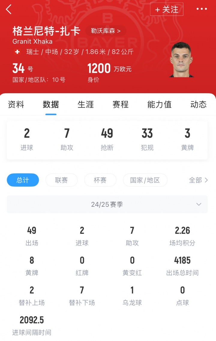 扎卡現(xiàn)年32歲,現(xiàn)效力于勒沃庫(kù)森,球員曾在2016年以4500萬(wàn)歐元轉(zhuǎn)會(huì)費(fèi)加盟阿森納,在效力槍手7年之后,勒沃庫(kù)森花費(fèi)1500萬(wàn)歐元(據(jù)德轉(zhuǎn)數(shù)據(jù))簽下扎卡,球員上賽季隨隊(duì)獲得德甲以及德國(guó)杯冠軍。目前扎卡德轉(zhuǎn)身價(jià)為1200萬(wàn)歐元。