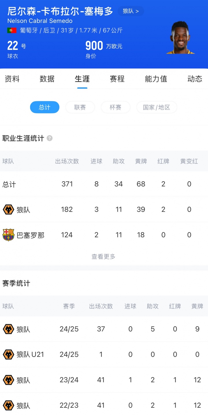 塞梅多于2020年9月以3200萬歐元的身價從巴薩來到狼隊,為球隊出場182次,打進3球助攻11次。