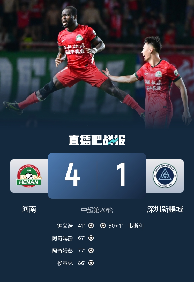 全場(chǎng)比賽結(jié)束,河南4-1深圳新鵬城。