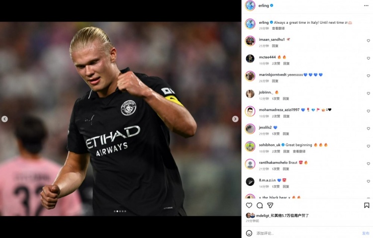 本場比賽哈蘭德首發(fā)出戰(zhàn)并有一球進(jìn)賬,哈蘭德也在社媒曬出自己慶祝進(jìn)球的照片,配文寫道:“在意大利總能度過不錯(cuò)的時(shí)光,期待下次再來!”