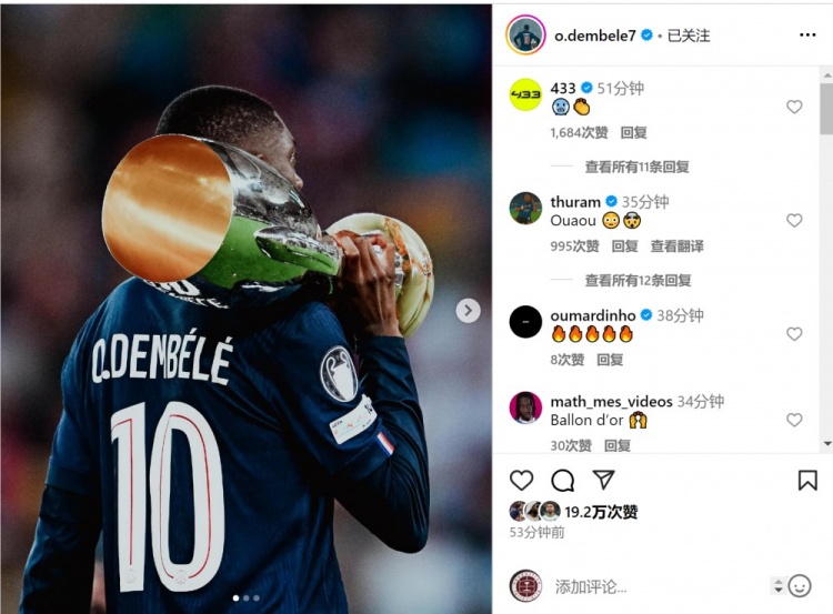 登貝萊當(dāng)選本場(chǎng)比賽最佳球員,賽后他在社交媒體上曬出肩扛獎(jiǎng)杯的照片,慶祝球隊(duì)奪冠。