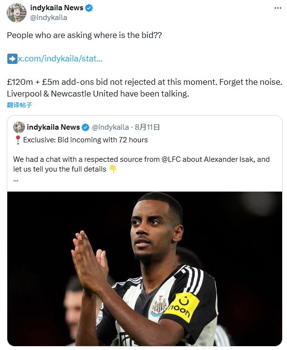 被球迷戲稱為“綠帽哥”的indykaila News再爆猛料:利物浦已經1.2億鎊+500萬浮動報價伊薩克,目前紐卡尚未拒絕這份新的報價。