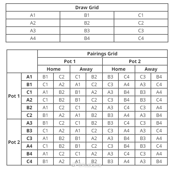 此次抽簽東西亞區(qū)仍將分開進(jìn)行。抽簽時(shí),將首先從1號(hào)種子里混抽確定A1、B1、C1、A2、B2、C2的球隊(duì),1號(hào)種子球隊(duì)全部抽完后,再從2號(hào)種子里混抽確定A3、B3、C3、A4、B4、C4的球隊(duì)。同時(shí),抽簽還將遵循同協(xié)會(huì)回避的原則,即來自同一協(xié)會(huì)的球隊(duì)將不會(huì)在瑞士輪階段進(jìn)行比賽,如果正巧抽到,將會(huì)手動(dòng)調(diào)整到下一個(gè)簽位。