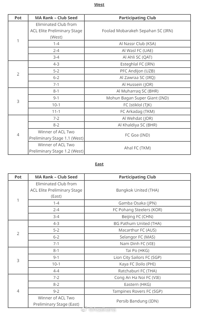 東西亞區(qū)仍將分開抽簽,每個小組將會分別有一支來自本區(qū)域1號、2號、3號、4號種子的球隊,北京國安和曼谷聯(lián)、大阪鋼巴、浦項鐵人同為1號種子球隊,因此他們將不會分在同一小組。同時,抽簽時還將遵循同協(xié)會回避的原則,即來自同一協(xié)會的球隊將不會分在同一小組。