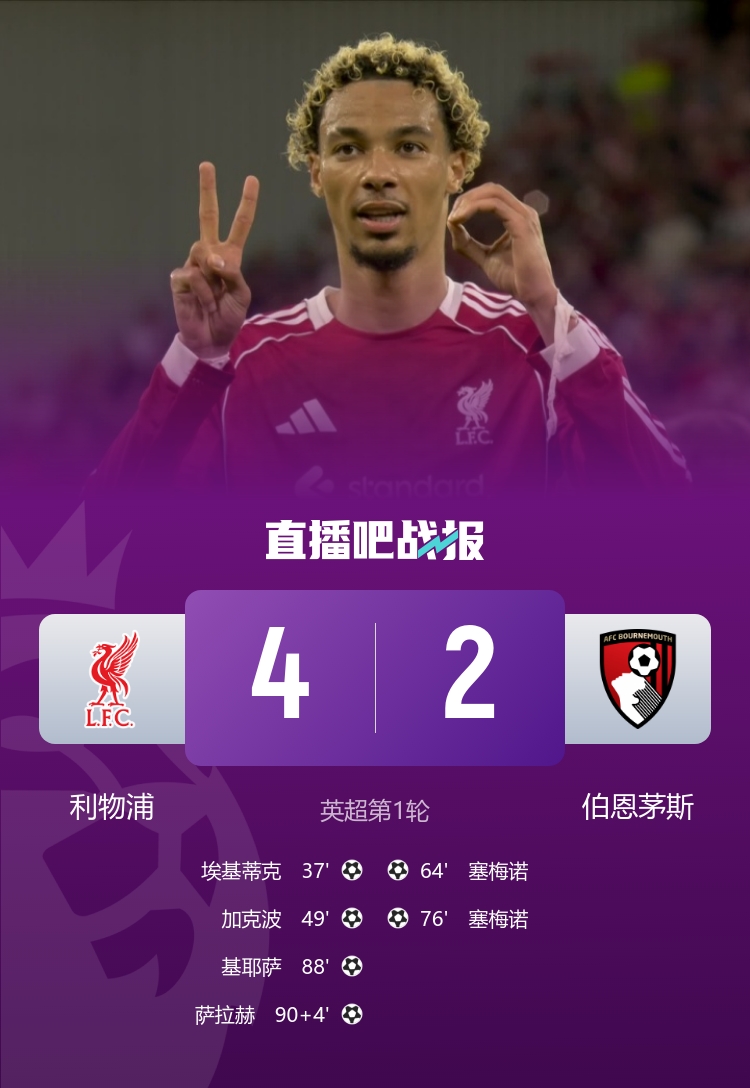 8月16日訊 25-26賽季英超揭幕戰(zhàn),衛(wèi)冕冠軍利物浦坐鎮(zhèn)主場安菲爾德迎戰(zhàn)伯恩茅斯。上半場,薩拉赫、范迪克造險,?;倏诉B場破門并致敬若塔。易邊再戰(zhàn),?;倏酥ゼ涌瞬ńü?,塞梅諾雙響,小基耶薩替補絕殺,薩拉赫鎖定勝局。最終利物浦4-2伯恩茅斯收獲開門紅。
